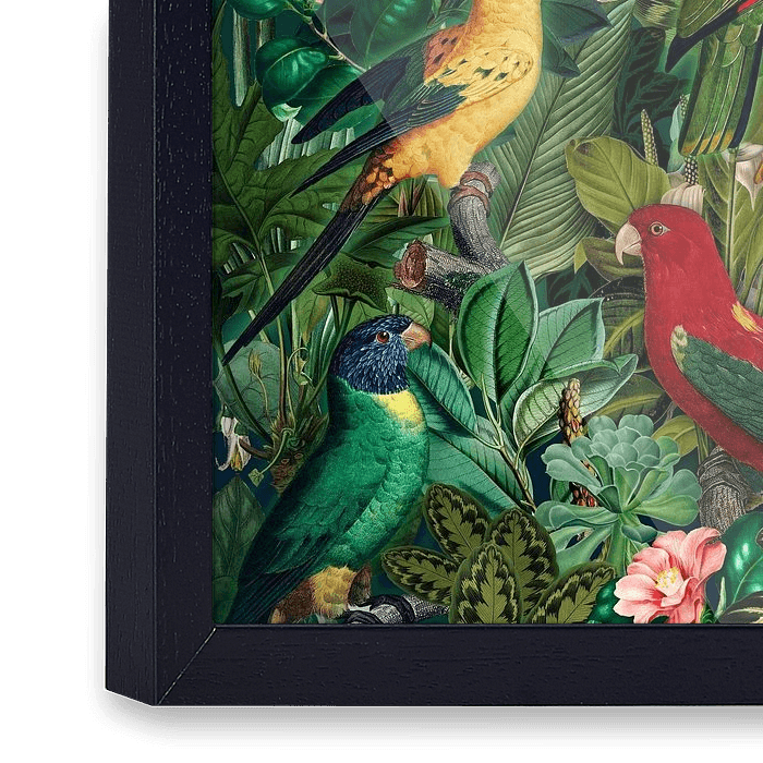 Papegaaien verzamelen zich 's avonds in het dichte gebladerte - collage van verschillende historische illustraties van planten en dieren