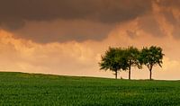 Een foto van het glooiende Nederlandse landschap in de provincie Limburg. We zien drie eenzame bomen op een heuvelrand met een achtergrond van naderend onweer.