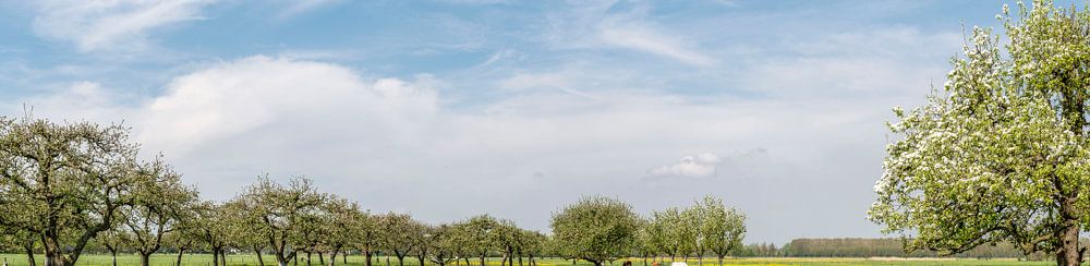 Voorjaar in de boomgaard met oude appelbomen in een weide met koeien in de verre achtergrond. Breed panoramisch landschap tijdens een mooie dag in de lente.