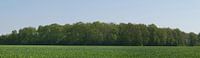 De boswal met voornamelijk eiken wordt prachtig door de zon in het licht gezet. Op de voorgrond een maisveld. Belangrijk voor de boeren als veevoer. De boswal is weer belangrijk voor de natuur. Zo is ons landschap verdeeld in leefruimte voor de mens en natuur en productieland. Helaas heeft het productieland weinig waarde voor de natuur. Moderne biologische landbouw en veeteelt moet dit even wicht herstellen.