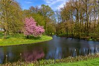 Landgoed Baak ligt op een mooie plek in de Gelderse Achterhoek in de IJsselvallei in de Gemeente Bronkhorst. We zien hier een deel van het park in het voorjaar met de ringgracht en een prachtig bloeiende Japanse sierkers.