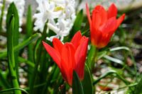 Wanneer je niet veel verder komt dan de tuin blijft het mogelijk om mooie plaatjes te fotograferen. Deze kleine tulpen stonden vanmorgen in het zonnetje naar mij te lonken om gefotografeerd te worden. De hyacint verzorgde de achtergrond, waardoor de kleur van de tulpen er nog beter uitsprong. Een stukje vrolijkheid zo dichtbij.