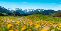 Voorjaarsachtig uitzicht over de bloemenweide tot aan de Allgäuer Alpen