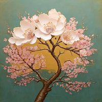 Een gestileerde Japanse kersenboom in volle bloei tegen een achtergrond van vintage kleuren. De compositie, met zijn ouderwetse, grillige accenten, geeft een romantische toon aan het geheel. Een zekere zachtheid en frisheid is voelbaar in zowel de kleuren als het afgebeelde thema.