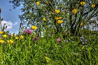Een feest van kleur hier in deze bloemrijke wei in de lente: boterbloem, rode klaver, weegbree en ereprijs.