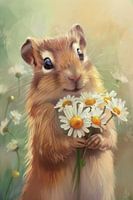 Een schattige muis houdt een boeket madeliefjes vast, omringd door zachte pastelkleuren en een lenteachtig tafereel. Deze illustratie straalt vreugde en onschuld uit en is ideaal voor iedereen die van dierentekeningen en bloemsierkunst houdt. De mooie details en het harmonieuze kleurenpalet brengen frisheid en levensvreugde in elke kamer.