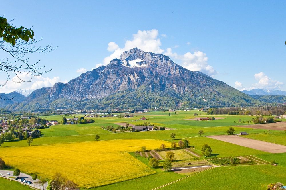 Voorjaarsraam met gele koolzaadvelden in Anif met uitzicht op de Untersberg
