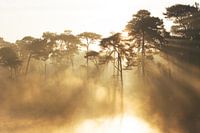 Goudkleurig strijklicht door de bomen met veel mist op het Voorste Goorven in Oisterwijk.