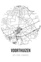 Zwart-witte landkaart, stratenplan of plattegrond van Voorthuizen. Voorthuizen is gelegen op de Veluwe, in de gemeente Barneveld, provincie Gelderland. Op de stadskaart zijn alle openbare wegen in Voorthuizen opgenomen. Verder is de kaart voorzien van de coördinaten van het centrum van Voorthuizen.