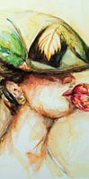 Aquarel van een vrouw die vooruit kijkt naar de toekomst. Zij heeft een tulp in haar mond , een tulp bloeit in het voorjaar en staat voor nieuw leven. Het is hier als een symbool voor een mooie gelukkige toekomst.