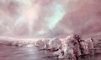 Een roze gekleurde lucht, de zon verbergt zich achter de donkere wolken en schijnt fel. De zonnestralen bereiken het gladde oppervlak van het water, vele tinten blauw, paars en aardetinten worden in het water weerkaatst. Ruige rotsen weerkaatsen het licht van de zon.