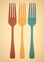 Een kunstdruk met drie vorken in drie verschillende kleuren - rood, geel en groen. Strakke, minimalistische stijl die perfect is voor een keuken of eetkamer.