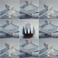 Een alledaags gebruiksvoorwerp in een collage geplaatst. Herhaling van beeld en toch ook net even anders hier en daar. De wat koele blauwige tint past wel bij dit beeld.