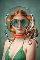 Een hyperrealistisch surrealistisch portret van een roodharige dame met sproeten, gekleed in een groene bikinitop en een oranje duikbril met teal-kleurige glazen. Over haar hoofd draagt zij een transparante glazen bol gevuld met water en kleine vissen, waarin licht en beweging subtiel worden vervormd. Aan de buitenkant van de bol kleeft…
