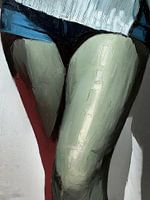 Dit schilderij toont een abstracte voorstelling van vrouwenbenen, gekenmerkt door krachtige penseelstreken en een gereduceerd kleurenpalet. De stijl doet denken aan expressionisme of moderne olieverfschilderijen, waarbij de vormen worden gedefinieerd door licht en schaduw en de textuur van de verf. De benen zijn gedempt groen-grijs, wat…