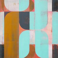 Dit abstracte werk is opgebouwd uit een reeks geometrische vormen die elkaar ritmisch afwisselen in kleur en richting. Het oog wordt geleid door afgeronde rechthoeken en gebogen hoeken die in lagen over elkaar lijken te liggen. De kleurencombinatie is opvallend: helder turquoise contrasteert met diep zwartgrijs, warm oker en subtiel roze – een palet dat tegelijk modern en retro aanvoelt.