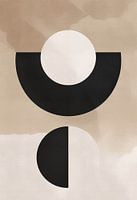 Minimalistisch abstract dat speelt met geometrische vormen en een ingetogen kleurenpalet. De centrale figuren, bestaande uit een cirkel en halve cirkels in zwart en wit, zijn geplaatst tegen een achtergrond met neutrale beige tinten.