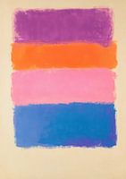 Een schilderij , drie horizontale balken in paars, roze, oranje en blauw op een crème achtergrond, minimalistisch, eenvoudige vormen, vlak, felle kleuren, zeefdruk, poster art, zeefdruk, zeefdruk, minimalistisch.