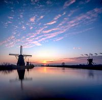 Na een nacht met temperaturen onder nul graden Celsius, stijgt de zon op Kinderdijk.