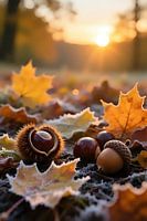 De camera richt zich vanaf de grond omhoog en legt een intieme doorsnede van de herfstgrond vast in macroperspectief met hoge resolutie, bezaaid met afgevallen bladeren in warme tinten. Bijna zichtbare esdoorn-, eiken- en beukenbladeren liggen op elkaar, hun nerven en randen haarscherp; aan sommige randen is fijne rijp zichtbaar,…