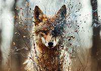 Tussen de takken en dorre bladeren doemt een figuur op, haast onmerkbaar verweven met zijn omgeving. De vos, een meester van camouflage en mystiek, kijkt met doordringende ogen naar de toeschouwer. Zijn vacht mengt zich met de twijgen die hem omringen, alsof de natuur zelf hem vorm heeft gegeven. Alsof hij niet zomaar een wezen is, maar een manifestatie van het bos zelf. Zijn blik is scherp, intelligent, bijna uitdagend.