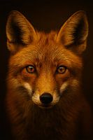 In zacht, warm studiolicht kijkt de vos recht in de lens, haar vacht glanzend als zijde in gouden tinten.