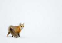 Vos (Vulpes vulpes) staand in de sneeuw in Yellowstone national park in Noord Amerika. Omkijkend over zijn schouder.