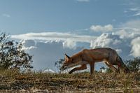 Een rode vos loopt door de duinen met in de achtergrond een mooie Hollandse wolkenlucht.