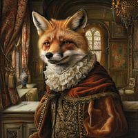 Dit artistieke portret toont een elegante vos in prachtige barokke kleding, versierd met uitgebreide franjes en mooie accessoires. De aandacht voor detail in de bontafbeelding en de vakkundig bewerkte stoffen geven de afbeelding een humoristisch maar indrukwekkend tintje. Een ideaal kunstwerk voor liefhebbers van ongewone dierenportretten en creatieve barokke voorstellingen, dat een blikvanger is in elke kamer en een glimlach tovert op de gezichten van degenen die het zien.