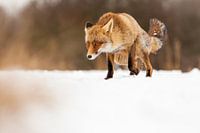 in de sneeuw lag ik neer terwijl een vos langs mij paseert die in de aanval was voor een andere vos, door zijn aanval moest hij of zij plassen.