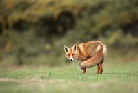 Een vos met een mooie vacht en volle staart staat in het Nederlandse duinlandschap