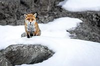 Deze foto toont een vos te midden van de besneeuwde bergen van Gran Paradiso Nationaal Park in Italië. De vos, met zijn dikke wintervacht en nieuwsgierige blik, vormt een bijzonder contrast met de helderwitte sneeuw en de ruige rotsen van het landschap. Gran Paradiso is een van de oudste nationale parken van Italië en staat bekend om zijn ongerepte natuur, hoge bergtoppen en rijke dierenleven. Het park is een ideale plek voor natuurliefhebbers en fotografen die op zoek zijn naar unieke ontmoetingen met wilde dieren in hun natuurlijke habitat.