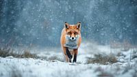 Een rode vos stapt zelfverzekerd door een besneeuwd winterlandschap naar de camera toe. Zachte sneeuwval omringt het dier en creëert een vredige en sfeervolle wildscène