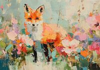 Een speelse vos staat in een kleurrijk bloemenveld, afgebeeld in een abstracte olieverfstijl. Heldere kleuren, zacht licht en dynamische penseelstreken geven het motief levendigheid en diepte. De focus ligt op het lichaam en de staart van de vos, omringd door kleurrijke bloemen in roze en groene tinten. De lichtgekleurde achtergrond met delicate accenten creëert een glinsterend, bijna magisch effect. Dit kunstwerk combineert natuurlijke schoonheid met artistieke expressiviteit en creëert een dromerige, levendige sfeer.