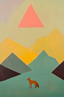 Glooiende heuvels in harmonieuze kleuren omlijsten een ondeugende vos die geniet van de rust van de natuur. Een zachtroze driehoek zweeft boven het landschap en geeft de afbeelding een dromerig tintje. Dit kunstwerk is ideaal voor in de woonkamer, creëert een ontspannen sfeer en nodigt uit om te dromen.