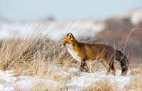 Vos staat mooi op een duin in de sneeuw, in een winters zonnetje.
