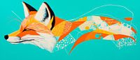 Een levendige vos, elegant en krachtig, trekt een dynamische lijn door de kamer met zijn stralende oranje en gele tinten. De gebogen vorm en frisse, turquoise achtergrond voegen een vleugje levensvreugde toe aan elke kamer. Perfect voor in de woonkamer om gesprekken te stimuleren en een uitnodigende sfeer te creëren.