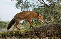 Een vos die over een gevallen boom loopt in de natuur, gemaakt met een groothoek lens.