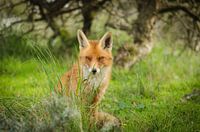 Een vos kijkt met felle vurige ogen om zich heen, en is zeer alert