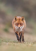 Oogcontact met een vos die recht op de camera komt afgelopen.