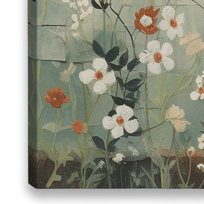 Vos - Hier zien we een charmant rustiek tafereel van een vos omgeven door een wildbloemenveld tegen een achtergrond van verweerde turquoise tegels, wat zorgt voor een heerlijk kalmerende en toch speelse toevoeging aan elke ruimte. De warme oranjebruine vacht van de vos steekt prachtig af tegen de koele achtergrondtinten, terwijl de…