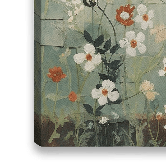 Vos - Hier zien we een charmant rustiek tafereel van een vos omgeven door een wildbloemenveld tegen een achtergrond van verweerde turquoise tegels, wat zorgt voor een heerlijk kalmerende en toch speelse toevoeging aan elke ruimte. De warme oranjebruine vacht van de vos steekt prachtig af tegen de koele achtergrondtinten, terwijl de textuurrijke verfpenseelstreken een bijna tastbare dimensie toevoegen.