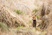 Een jonge vos verkent de wereld. Het welpje volgt een paadje door het pijpenstrootje.