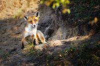 een nog niet zo oude vos zit vanuit de duinen te kijken naar de fotograaf