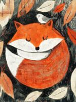 Een schattig oranje vosje nestelt zich tussen zachte bladeren, terwijl een klein vogeltje op zijn kop tikt. De vriendelijke gezichten en warme herfsttinten maken dit tafereel perfect voor in de kinderkamer. Samen vormen ze een rustgevend duo dat uitnodigt tot verhalen over bosavonturen en nieuwe vriendschappen.