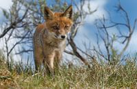 Een kleine vossen welp bekijkt de wereld om zich heen , met in de achtergrond een echte Hollandse lucht.