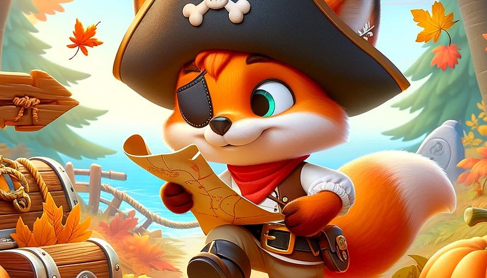 De afbeelding toont een idyllisch herfsttafereel waarin een vossenwelp verkleed is als piraat. Hij draagt een grote, zwarte driekantige hoed versierd met een symbool van een schedel en gekruiste botten en houdt een schatkaart vast. Hij staat midden in een bos vol gouden en rode herfstbladeren. De warme kleuren van de herfstbladeren creëren een rijke, kleurrijke achtergrond, die wordt overspoeld met zachte zonnestralen. Naast de kleine vos piraat staat een grote, houten schatkist vol met glinsterende munten en juwelen. Verspreid over het tafereel liggen pompoenen in verschillende maten en vormen, die het beeld aanvullen met een gevoel van oogsttijd en overvloed. Vallende bladeren zweven boven de vossenwelp en dwarrelen zachtjes naar de grond. Op de achtergrond wijst een houten bord naar verdere avonturen. Deze betoverende afbeelding weerspiegelt de geest van ontdekking en verbeelding, vermengd met de gezellige sfeer van een herfstbos.