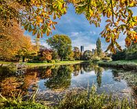 Uitzicht op Leeuwarder toren vanuit het Vosseparkje in de herfst
