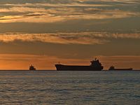 Opname van English Bay bij Vancouver, Brits Columbia, Canada na zonsondergang met de lucht oranje gekleurd en de silhouetten van voor anker liggende vrachtschepen.