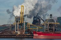 De loskranen aan de wal het schip met het karakteristieke haaienbek embleem op de boeg. De stoomwolken van de koeltoren van de staalfabriek aan de wal. Het straalt kracht uit. Ik loop vaak in deze omgeving en de wolken waren extra aanwezig.